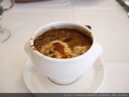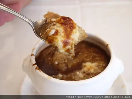 最愛上頭那一塊吸得飽飽湯汁的法式麵包帶著一些起士