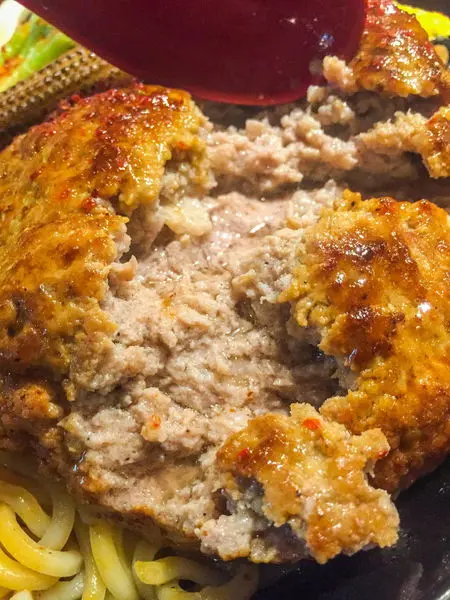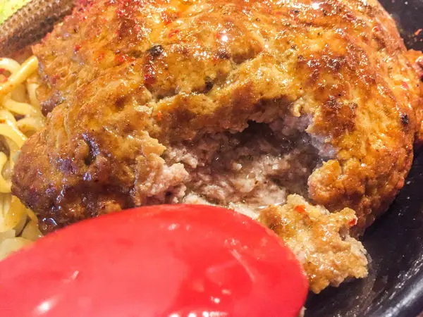 漢堡排差不多一個成人2/3個巴掌大,中間空心,一剝開來肉汁四溢,
