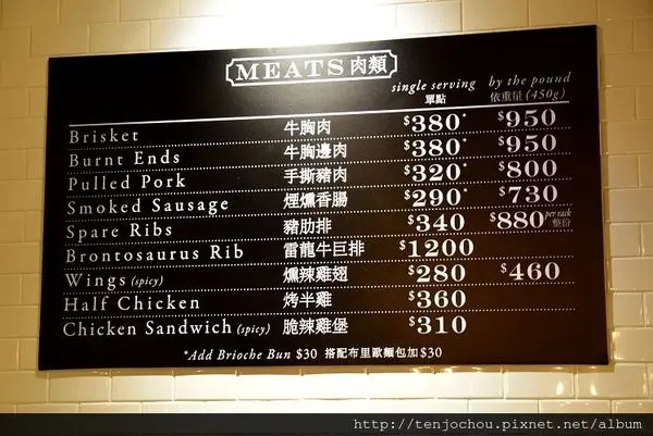 肉類可單點也能依重量計價,品項有:牛胸肉、牛胸邊肉、手撕豬肉、煙燻香腸、豬肋排、雷龍牛巨排、燻辣雞翅、烤半雞、脆辣雞堡