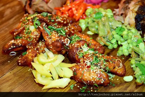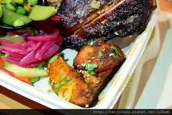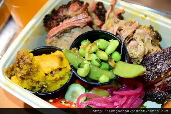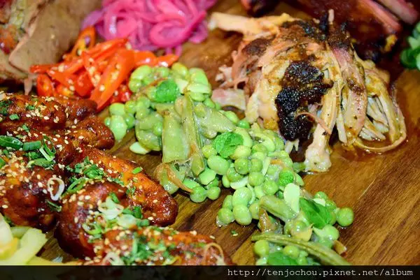 現場展示的餐點為:牛胸肉、手撕豬肉、豬肋排、燻辣雞翅;配菜:醃菜、陶鍋甜薯泥、枝豆甜豆翠綠沙拉