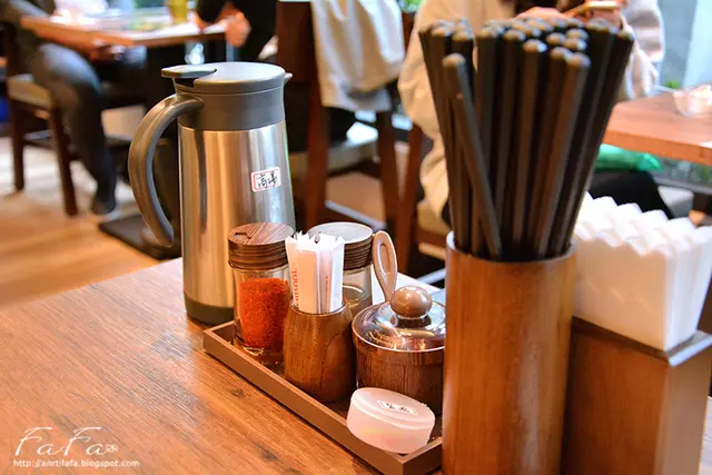 桌上擺放的物品中有店家自製的蝦鬆、辣油醬、白醋、高湯保溫瓶,