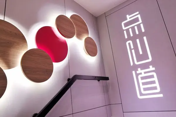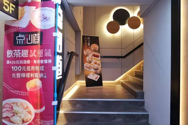 轉角樓梯處放有「點心道。8大招牌」看板,走廊已圓點普普簡約風格佈置。