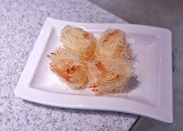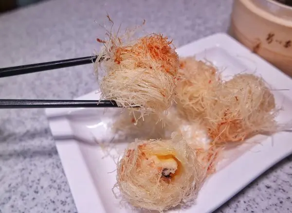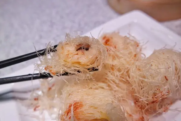 金黃酥脆的粉絲細如髮絲般,已蝦仔粉點綴,纏繞包裏的起司、香菇、蝦漿Q彈,