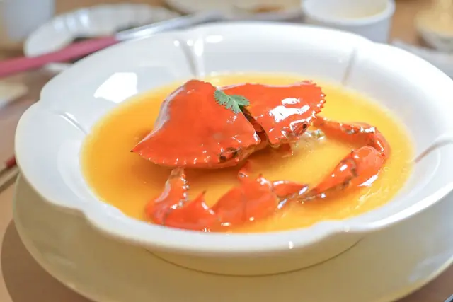 充滿蟹鮮甜的蒸蛋,入口滑順如布丁口感又帶著花雕酒香,熱呼呼的好暖味。