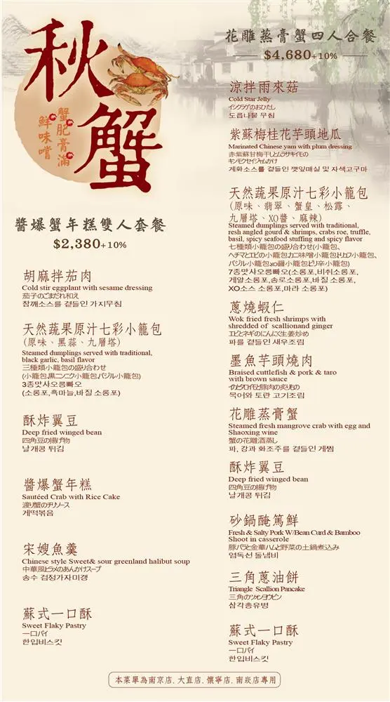 秋天是食慾之秋,聯想到莫過於肥美飽滿的秋蟹了!「點水樓」最著名的是七彩冠軍小籠包,因應季節推出秋蟹套餐,有雙人套餐、四人套餐與十人桌菜,也有單點秋蟹料理,榮獲台灣餐館五星評價的點水樓有許多間分店,有獲得米其林推薦是南京店,也是我們這次前往的店家,這次介紹是四人秋蟹套餐。