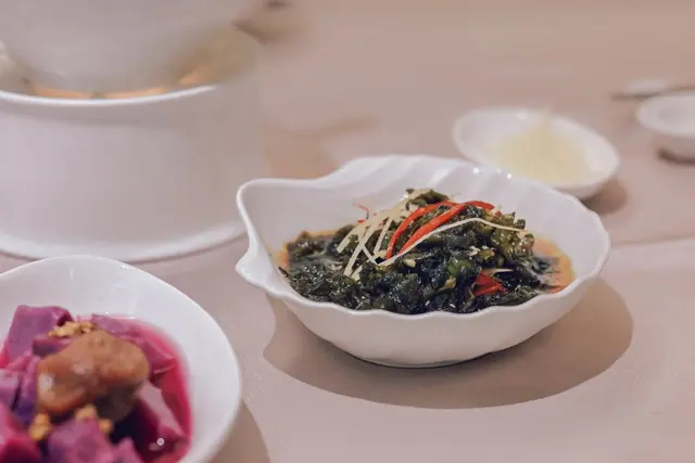 第一道小菜就充滿詩情畫意,雨來菇並非菇類而是藻類,只有在雨季過後才會冒出,是原住民口裡傳說中「情⼈的眼淚」,點水樓以涼伴小菜形式呈現,酸甜開胃,相當爽口。