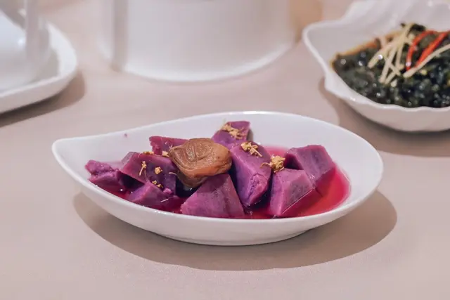 紫色芋頭地瓜燉煮得非常軟爛,伴隨著紫蘇梅的酸度,尾韻桂花的香氣,相當優雅慢調。