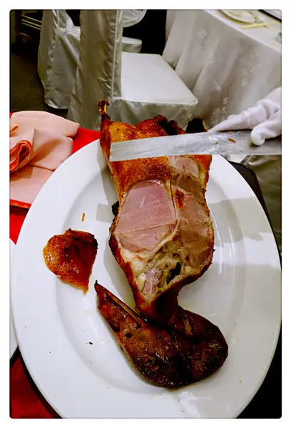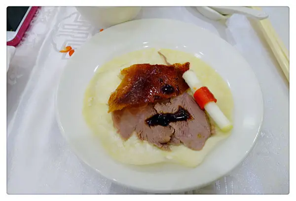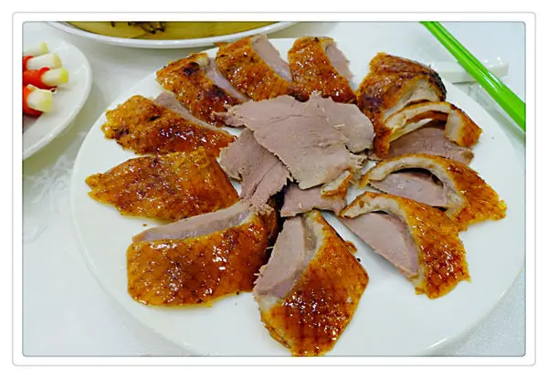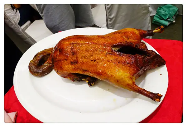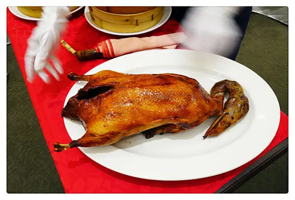 招牌! 來龍都就是要吃烤鴨呀 不然來幹嘛!! 金黃色油油亮亮又香噴噴的烤鴨 服務人員會桌邊服務 先端上來讓我們看一眼 再詢問用餐客人要不要拍照 ? 當然要呀 如果不拍就要下刀嘍