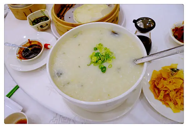 果然整鍋粥 滿滿滿 去骨的粥裡面真的一丁點鴨的踪跡都沒有 只見皮蛋 & 薑絲 還附上了一盤炸過的餛飩皮 可以加入一起吃