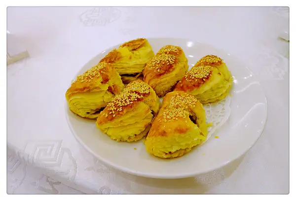 金黃色的叉燒酥 外皮是一層層堆疊的 稍微偏乾了一點 還好一人一半分食著吃