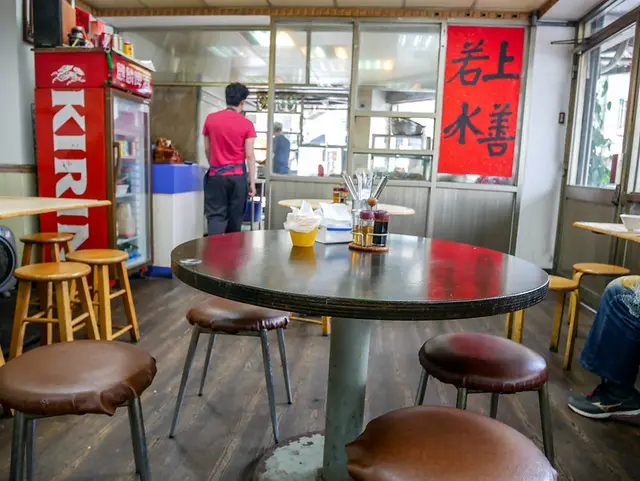 就桌子與板凳 ,桌上的佐料是醬油與醋,如果要辣油的話要去冰櫃拿,這邊也有提供飲料