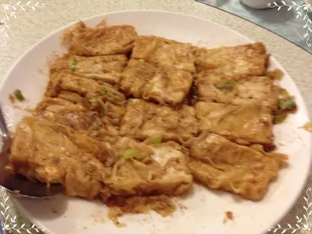 鍋塌豆腐:看起來軟軟爛爛賣相很不好,吃起來鹹鹹甜甜,豆腐外皮軟爛裡面也軟,吃起來滿奇怪的,不是很推。