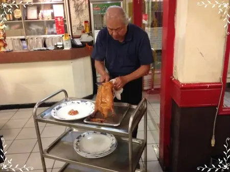 我們的烤鴨$1200終於上菜,見老闆手腳俐落的一片片把鴨皮片和鴨肉下來