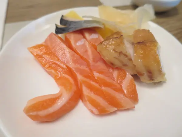 生魚片應該是必拿的吧 看到鯊魚烟覺得很妙 所以也拿了一點 鮭魚好滑潤阿~~~