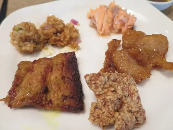 照燒杏鮑菇/香煎豬五花/辣味炸雞/天婦蘿/炸蝦等等