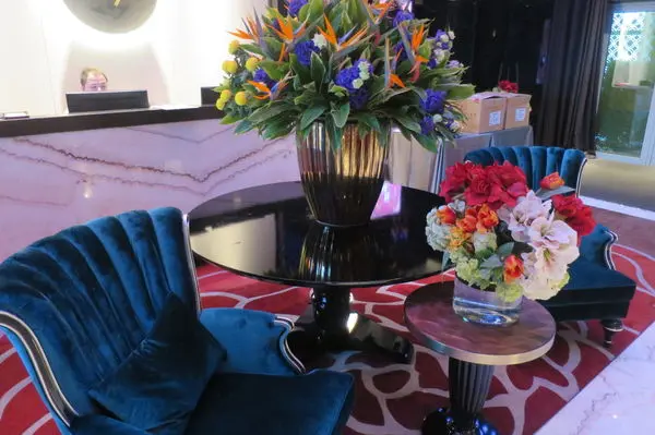 就連等電梯的樓梯間也是鮮花超奔放的迎客阿
