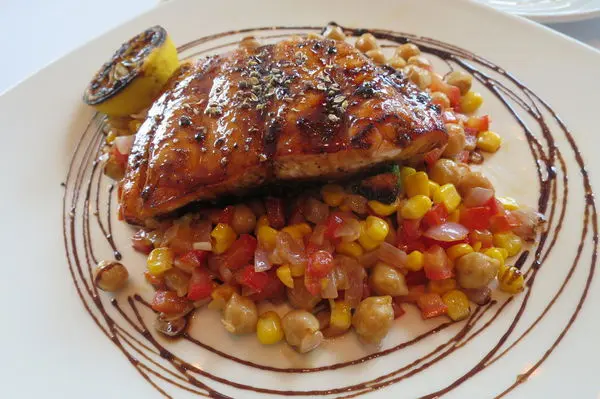 [蜂蜜巴薩米克醋香烤鮭魚] 這是不吃牛的友人點的鮭魚 看起來很不錯 魚排超大一份