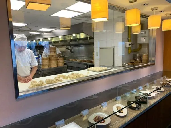 有將一片的廚房以玻璃窗的方式可以看到在做湯包的廚師們
