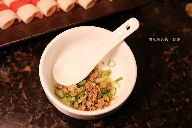 湯底上桌滾過後服務人員會將裝有蔥及牛肉末的碗拿上桌