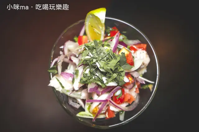 把新鮮的白魚肉放進檸檬醬汁裡攪拌均勻,加上牛番茄、生菜、洋蔥、香菜下去混合