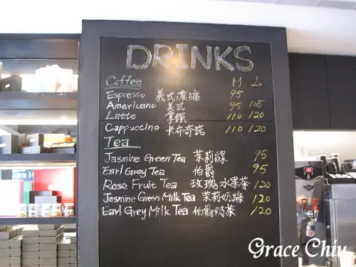 店裡飲品有咖啡及茶類,價格95~120元不等,價位有點出乎我意料外的不算太貴丫!我們點了二杯大杯熱拿鐵.