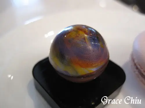 先來看看星球巧克力(蜂蜜口味),呈盤時底下架了一個小架子,比起其他色彩鮮明的巧克力球,這顆蜂蜜口味的外層色澤顯的較為沈穩,在多彩色澤中還帶著金黃色的小華麗炫彩.