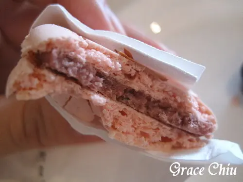 玫瑰覆盆子馬卡龍,輕輕的,酥酥的,一入口就緩緩的化開,帶著濃厚的玫瑰香氣,不會過酸的覆盆子餡還不錯.
