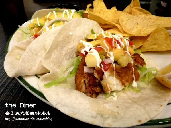 曬黑黑鮮魚塔可 / 340元 非常美式的份量, 光看就讓人覺得飽, 有三份份量不小的墨西哥塔可, 再配上玉米脆片及莎莎醬.