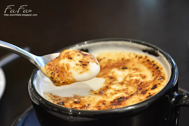 上方又以炙燒砂糖方式化成漂亮的霧狀焦糖,喝起來會先觸碰到微硬微脆的新奇感,
