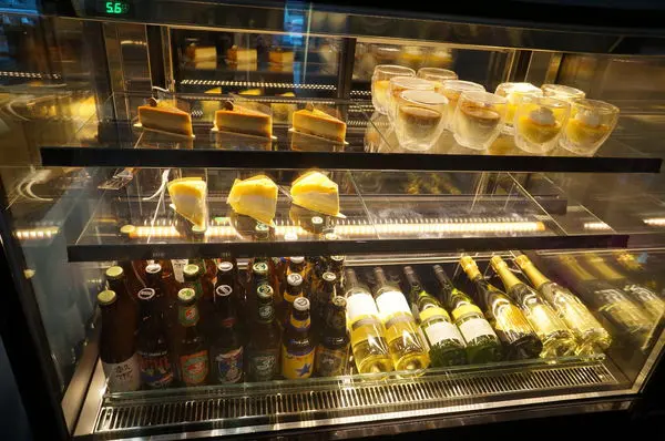 冷藏櫃擺放著蛋糕以及精釀啤酒跟白酒(未成年請勿飲酒,開車不喝酒!)