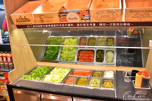 生菜櫃滿滿的配料要加多少都可以,只要不滿出來甚至能夾到一整顆牛番茄。