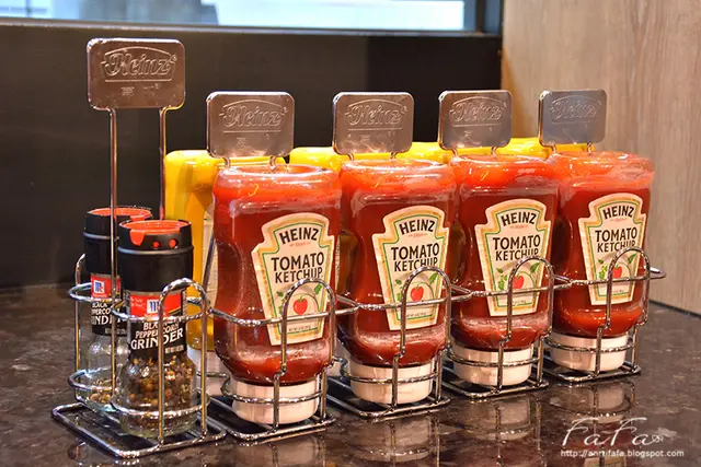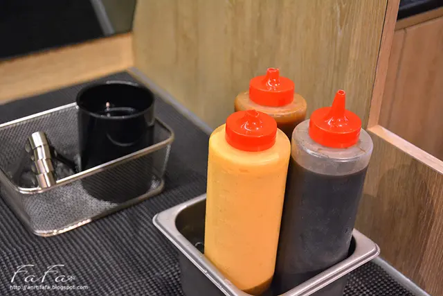 照燒醬(黑) Teriyaki Sauce、BBQ(酒紅色)、酸甜醬(粉色)Russian Dressing