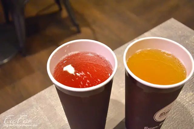 蔓越莓汁,水感多有稀釋感味道淡,旁邊則是臻茗堂無糖綠茶。