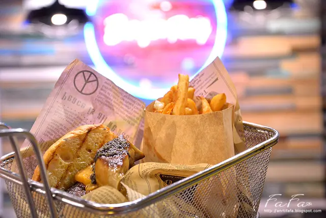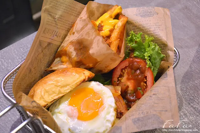 餐點是裝在薯條網油炸籃裡面,將薯條拿起就能塞滿滿的生菜配料。