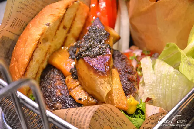 一開始松露香氣就蠻明顯的,鴨肝口感緊緻微微Q嫩感,本身沒什麼味道,吃起來有點無趣,主要還是內層的漢堡肉原味香氣且多汁軟嫩外層一點點脆口感,不鬆散,