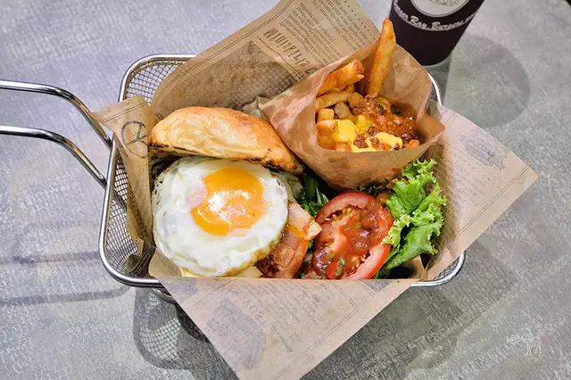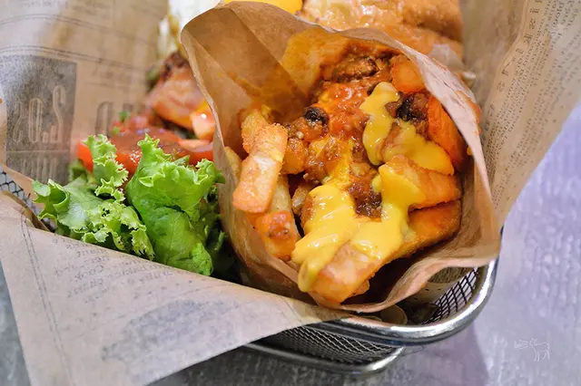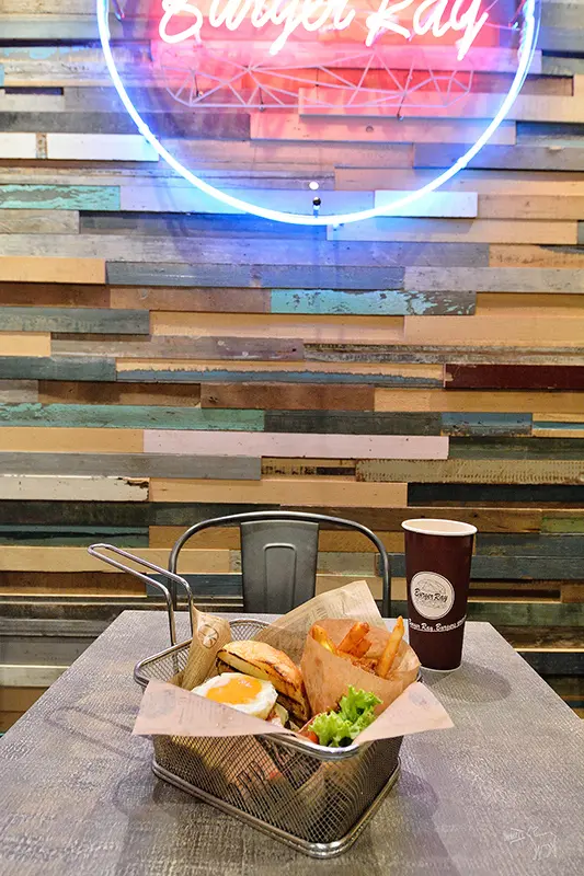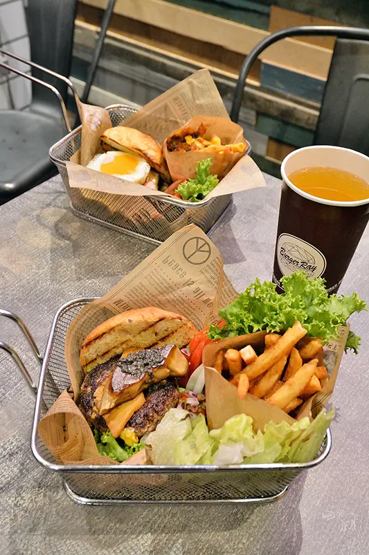 台北東區的Burger Ray 個性漢堡可以依照自己喜歡的組合,麵包與配料也可自選,像是焦糖洋蔥、太陽蛋、厚培根、蘑菇等,生菜也可自己拿取量與種類,薯條更有起士醬與肉醬能搭配!