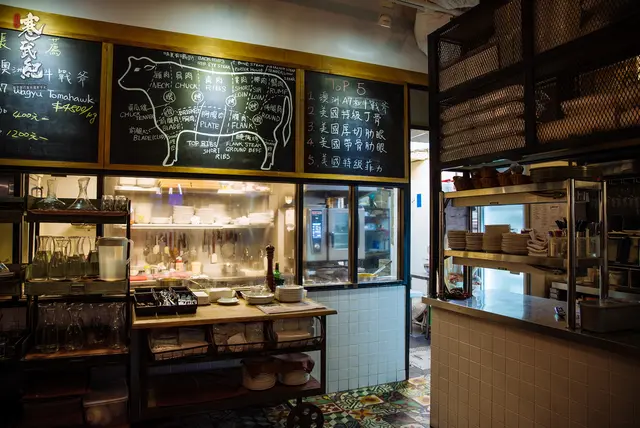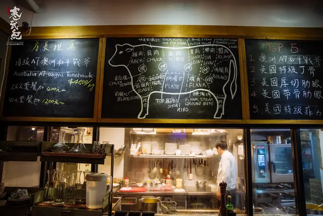 大廳廚房牆上高高掛著牛排各部份肉的分區介紹,還寫了店內人氣最高的五種排餐,想當然爾,人氣NO.1一定是「澳洲A7和牛戰斧」啦!