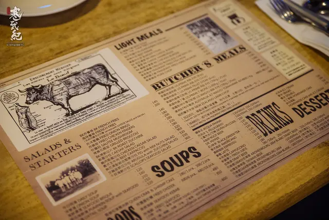 看起來仍然很有西部風味的菜單,設計的有點像懸賞單的風格,用牛皮紙刷,一兼二顧,同時也能當桌墊使用。