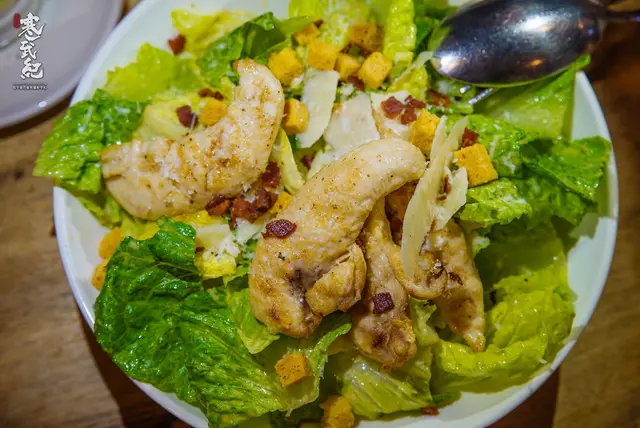 雞肉凱薩沙拉(套餐+40元可升級):包子爸今晚點的是和牛戰斧套餐,已經有內附4份個人沙拉了,但是看到這雞肉凱薩沙拉看起來也很好吃,就詢問服務人員可否加價更換,多40元就能吃到如此大份量的雞肉沙拉,包子爸挺推薦的!