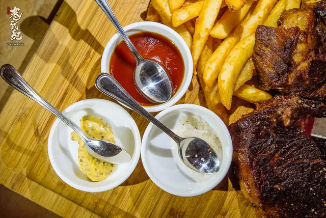 隨著牛排附上三種調料,白色的是海鹽、黃色的是芥子醬,另外一碗看起來像蕃茄醬的是什麼呢?原來是店家用牛油、牛骨、牛筋慢火熬煮出來的經典「肉汁」,這在國外是很常見的沾醬,無論是沾薯條或是搭配牛排、沙拉一起吃都超濃郁帶味!