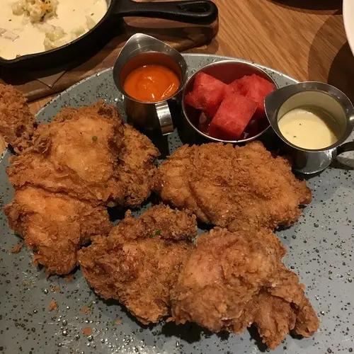 雞腿雞胸肉,裹上特製的炸雞粉酥炸,附醃西瓜、蒜味白乳酪醬和紅辣醬