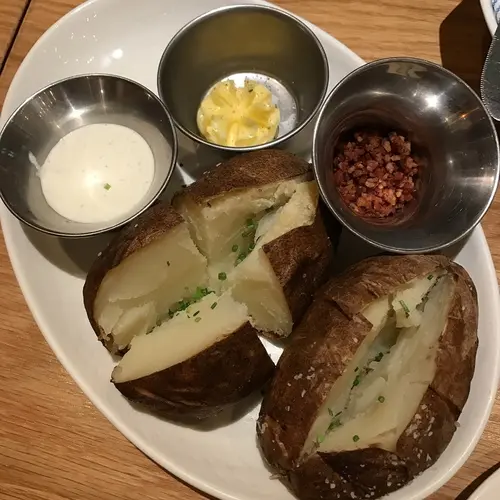 烤馬鈴薯本身無味,加佐酸奶醬頗搭,焦脆培根碎太細脆且過焦,咬起來偏硬,可撒些培根碎在馬鈴薯上,可添些鹹味