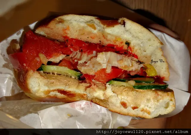 貝果口感軟Q 稍乾 不過搭配中間配料一起享用就沒有這個問題