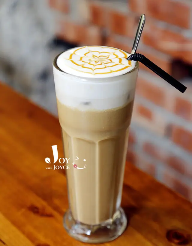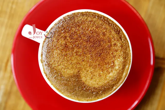 澎澎的奶泡上灑滿了黑糖,炙烤過的表面,”