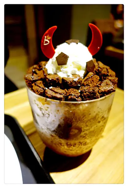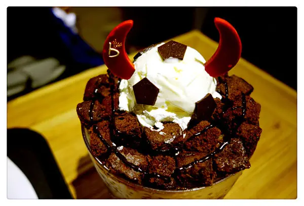 香草冰淇淋上插著化身惡魔獨角的巧克力片,刨冰上撲滿了巧克力布朗尼,刨冰也不是一般的碎冰 而是顆粒的 比較有口感,咬下去會「ㄎㄠ ㄎㄠ ㄉ」的聲音!