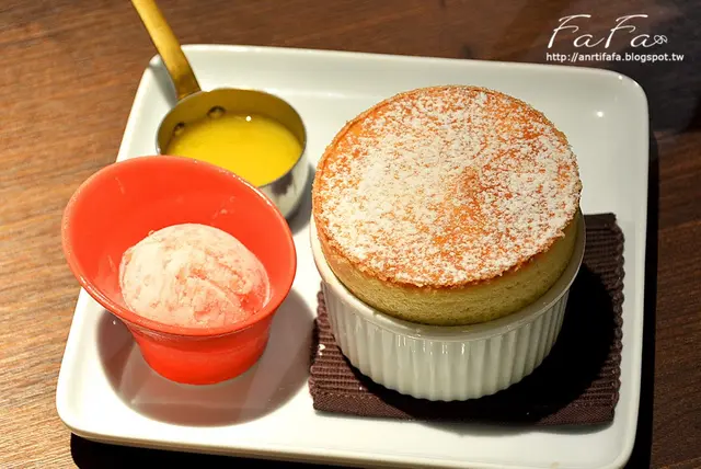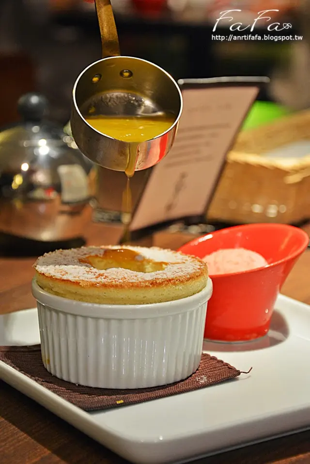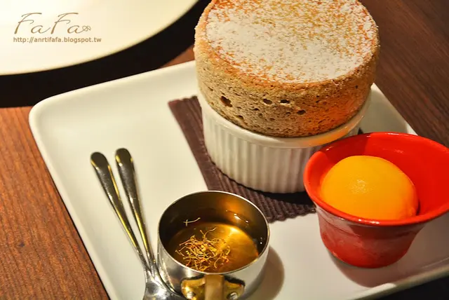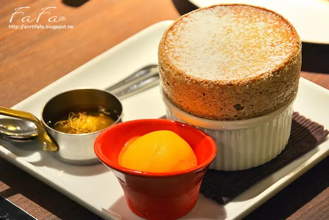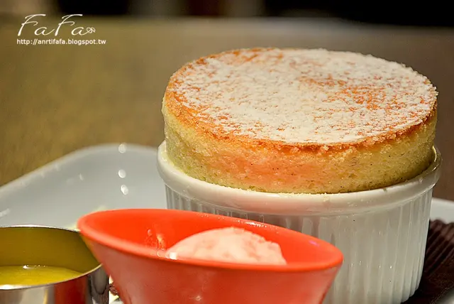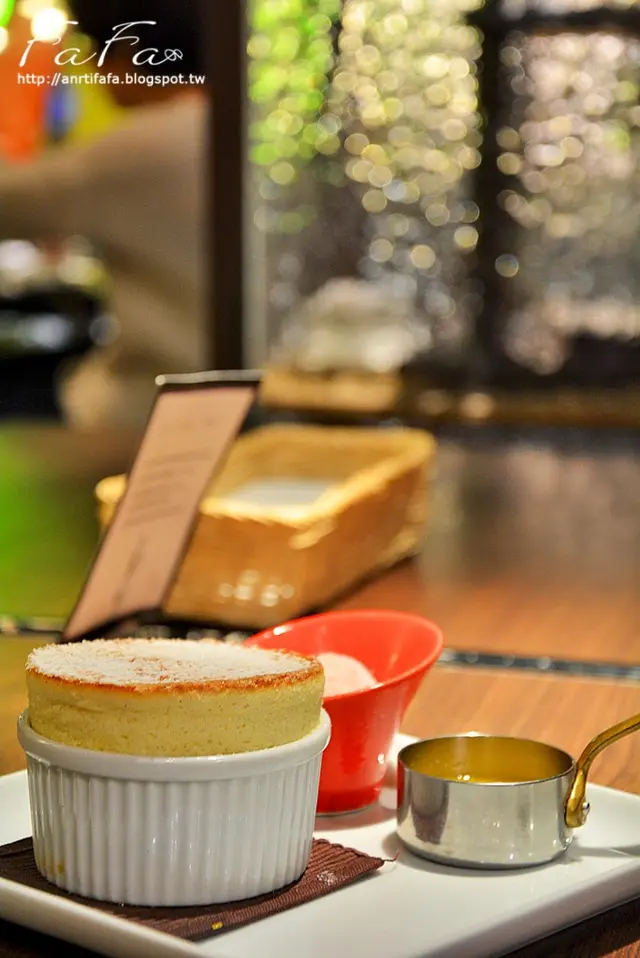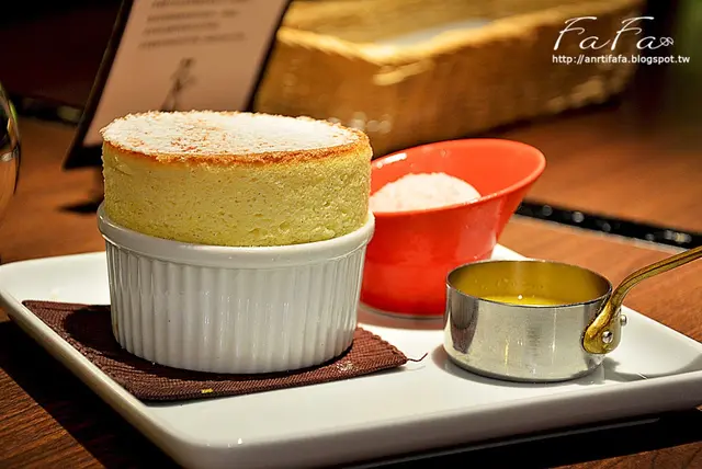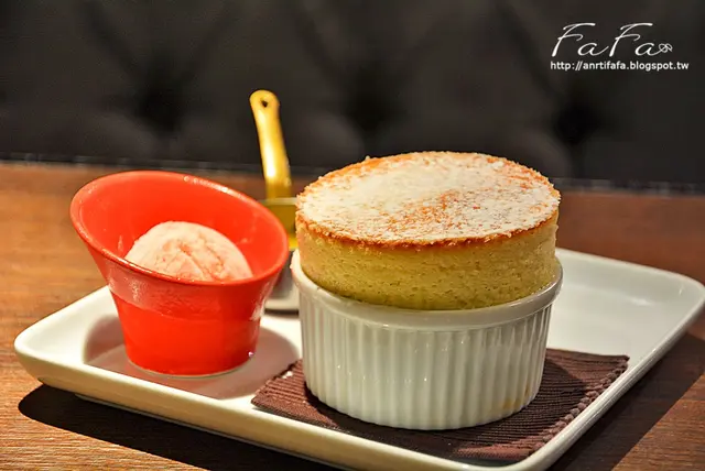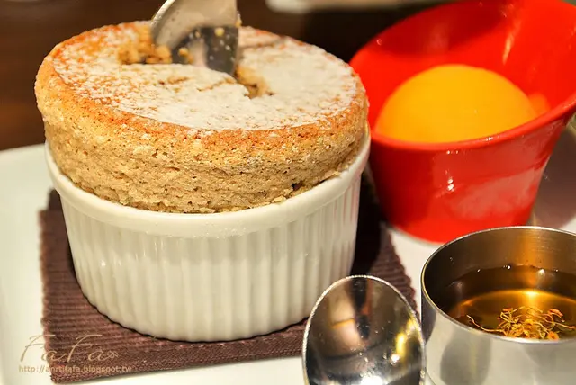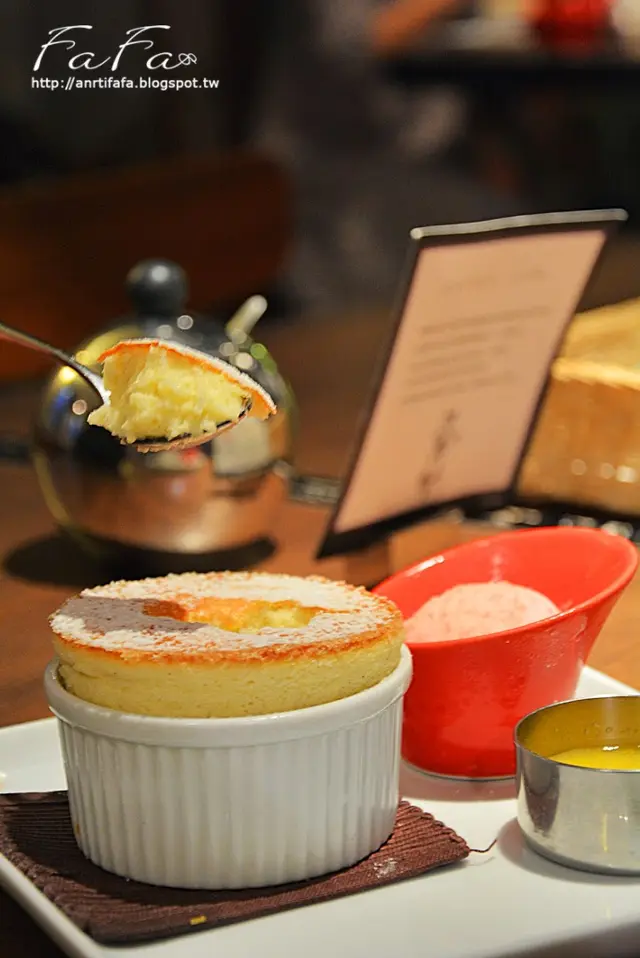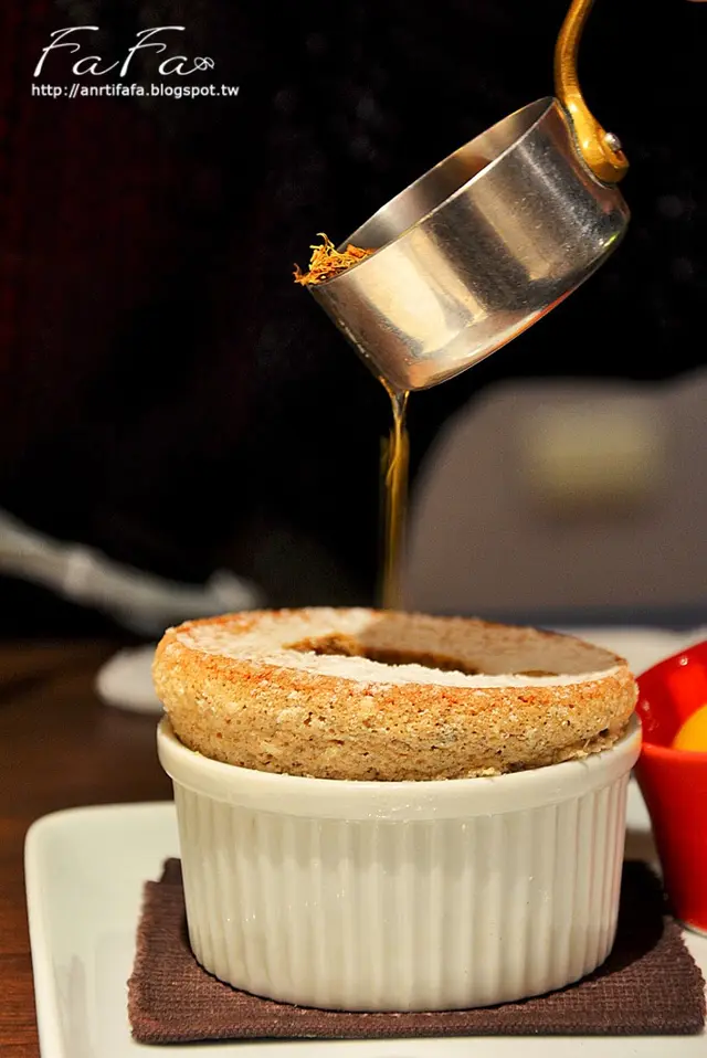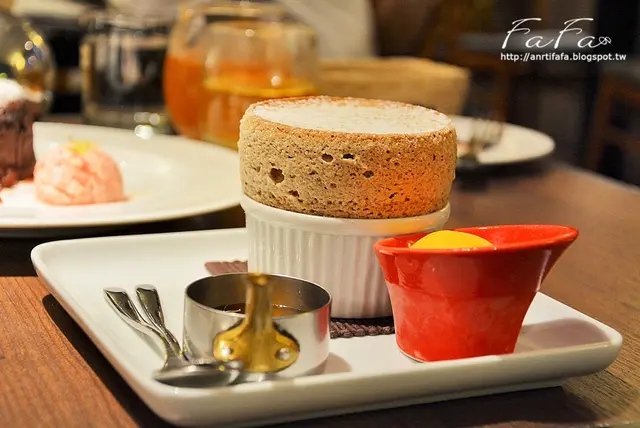 黑色茶點裝飾著舒芙蕾,吃下的每一口都傳來陣陣茶香韻味,外層細緻酥脆內部軟滑綿密。