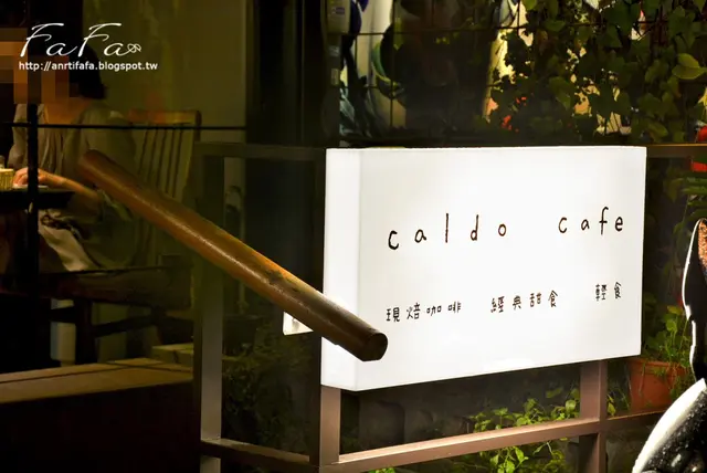 Caldo Cafe在巷弄裡頭,不過夜晚時從遠處看沒特別明顯,直到經過這個白潔亮眼的招牌才發現。