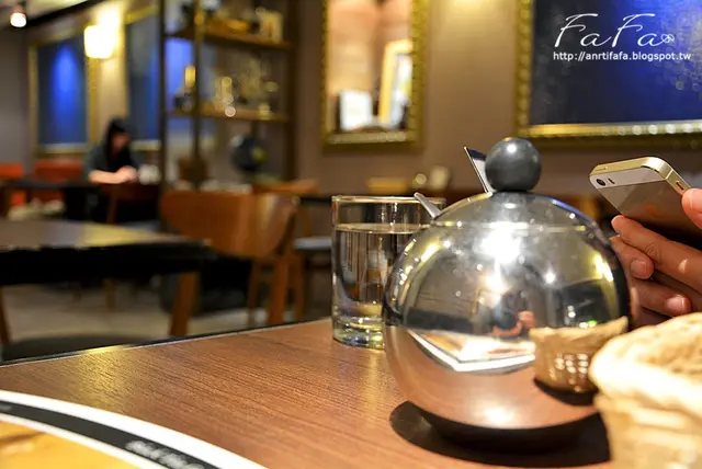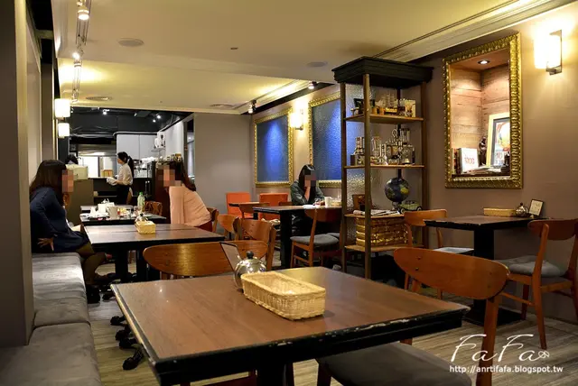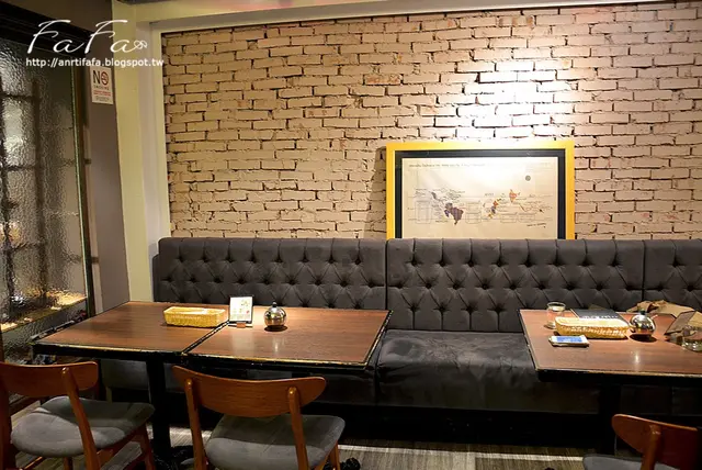 店內的灰藍色調沙發座椅還有後方文化石牆面搭配起來很有歐式復古風格,也讓人感覺溫馨舒適。