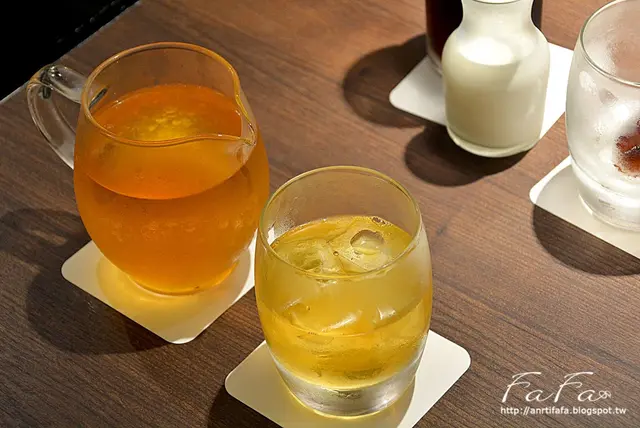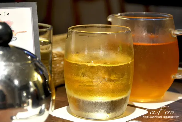還以為會出現蘋果塊、黑莓之類的配料,蘋果茶的顏色呈現金色很漂亮,壺中蘋果茶沒有冰塊稀釋,