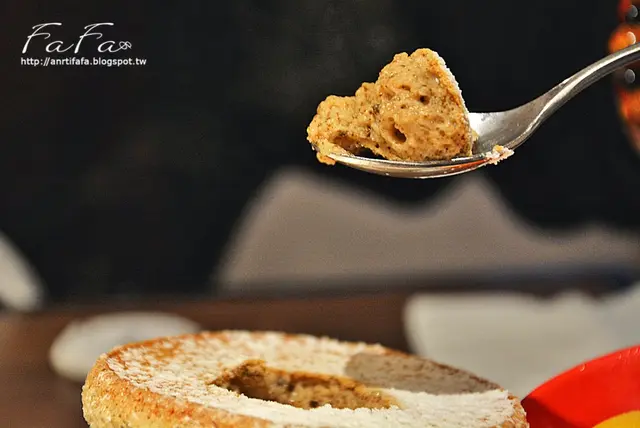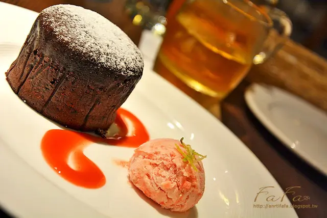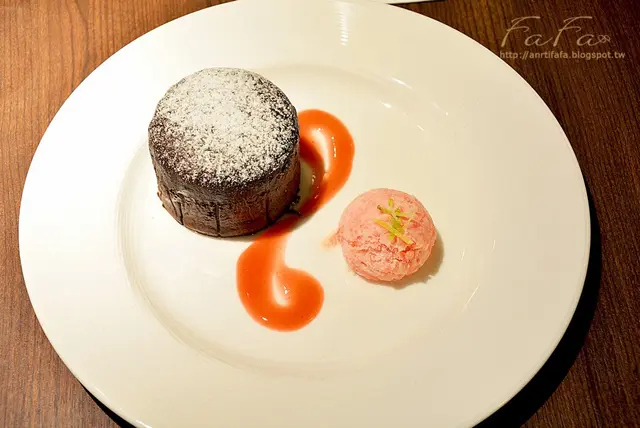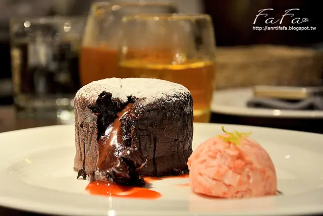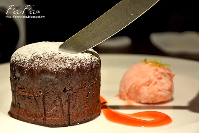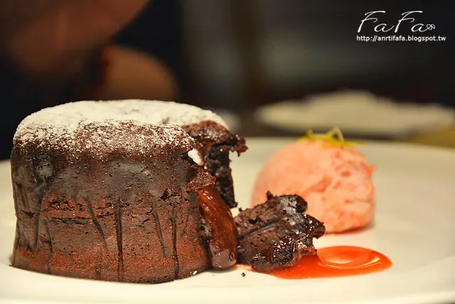 那絲滑濃稠巧克力漿順著缺口渲染在白色盤子上,巧克力漿吃起來不甜膩,帶點苦味很香醇濃郁,